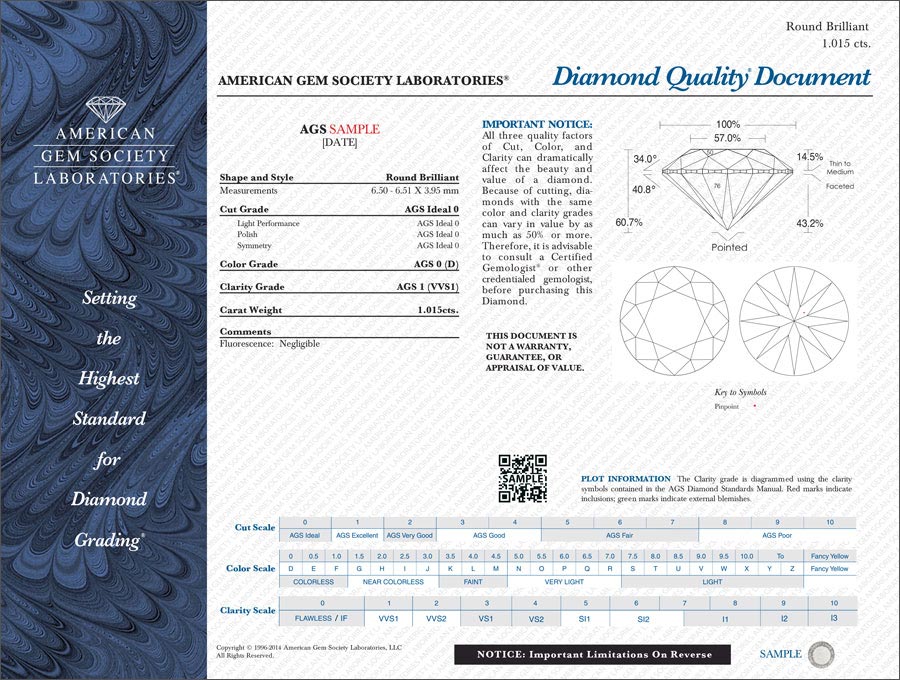 Τα εργαστήρια AGS εξυπηρετούν ένα διεθνές πελατολόγιο, αποτελούμενο από αντιπροσώπους λιανικής πώλησης κοσμημάτων, προμηθευτών χονδρικής, κόπτες διαμαντιών και κατασκευαστές. Το έγγραφο ποιότητας της AGS ή DQD, παρέχει βαθμονόμηση της ποιότητας κοπής για στρογγυλά διαμάντια, καθώς και πληροφορίες σχετικές με τα 4 C της ταξινόμησης των διαμαντιών.H βαθμολογία καταρτίζεται με βάση μία κλίμακα από 0 έως 10.