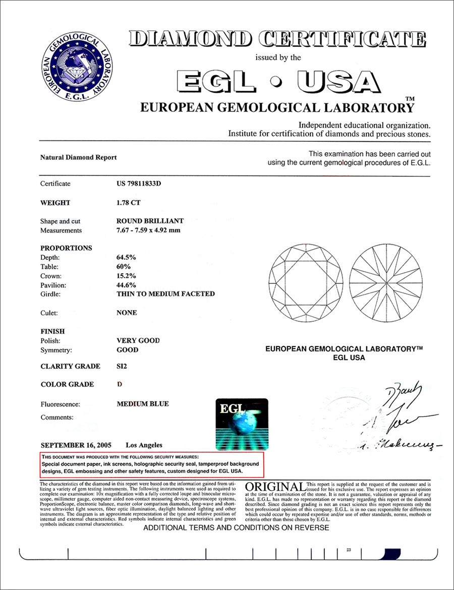 Η σταθερή αυτή σφραγίδα επιβεβαιώνει ότι το συνοδευτικό πιστοποιητικό συμφωνεί με το προς πώληση διαμάντι. Το EGL πιστοποιητικό είναι μια συμπυκνωμένη έκθεση, η οποία καταγράφει το βάρος σε καράτια, την ποιότητα χρώματος, τον βαθμό καθαρότητας και το διάγραμμά του. Βάσει της εν λόγω έκθεσης καθορίζεται η τιμή αγοράς ή πώλησης ενός διαμαντιού.