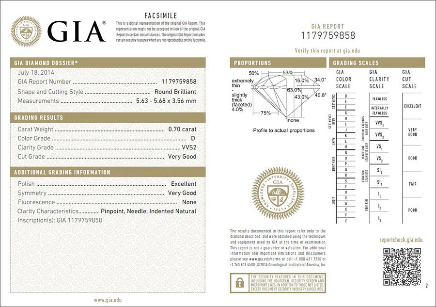 Το πιστοποιητικό καταγραφεί τα «4 C» του διαμαντιού σας: το Χρώμα (Colour), την καθαρότητα (Clarity), το βάρος σε καράτια (Carat) και την περιγραφή του σχήματος/Κοπή (Cut), με τις μετρήσεις του διαμαντιού π.χ. το βάθος σε ποσοστά, την ποιότητα λάμψης και τη συμμετρία. Θα πρέπει επίσης να αναφέρει χαρακτηριστικά όπως ο φθορισμός ή τυχόν ατέλειες. Τέλος, το πιστοποιητικό θα πρέπει να περιλαμβάνει ένα λεπτομερές σχέδιο του διαμαντιού.