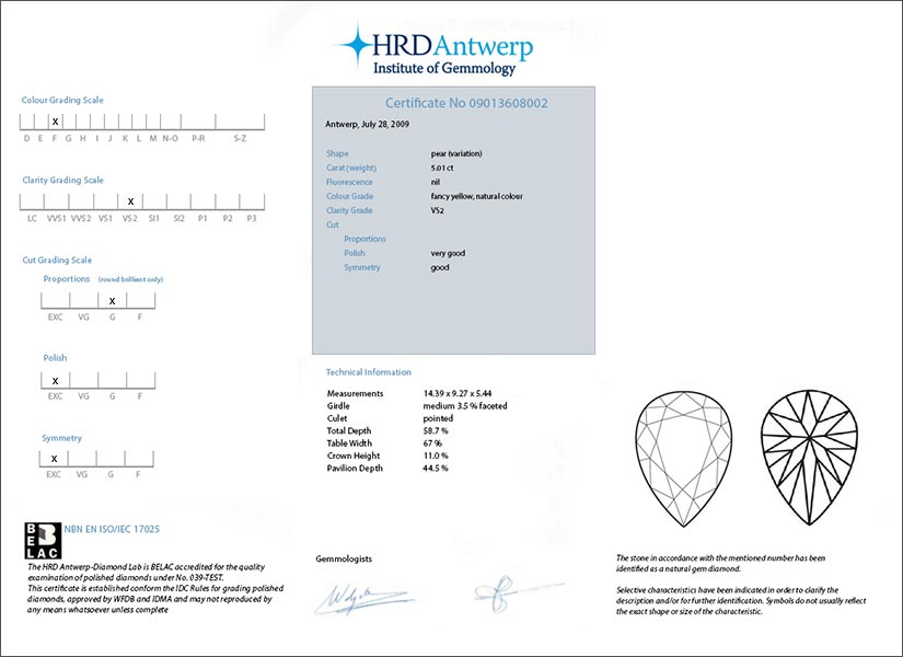 Το μη κερδοσκοπικό Ανώτατο Συμβούλιο Διαμαντιών είναι ο επίσημα αναγνωρισμένος εκπρόσωπος εμπορίας διαμαντιών του Βελγίου. Το πιστοποιημένο εργαστήριο HRD έχει εξελιχθεί σε ένα από τα μεγαλύτερα εργαστήρια πιστοποίησης διαμαντιών στον κόσμο. Η έκθεση αυτή περιλαμβάνει μια πλήρη περιγραφή της ποιότητας του διαμαντιού, συμπεριλαμβανομένου του σχήματος, του βάρους, της καθαρότητας, του φθορισμού, του βαθμού χρώματος, των μετρήσεων, των αναλογίων και του φινιρίσματος ποιότητας και συμπληρώνεται, όπου αυτό είναι απαραίτητο, με επιπλέον σχόλια.